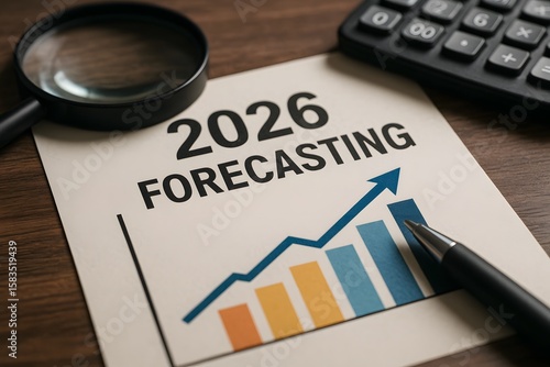 forecast, 2026, analysis, planning, finance, chart, arrow, projection, prediction, concept, strategy, business, datum, growth, statistic, trend, budget, insight, graph, future, expectation, performance, target, management, metric, estimate, market, evaluation, research, notebook, magnifier, calculating machine