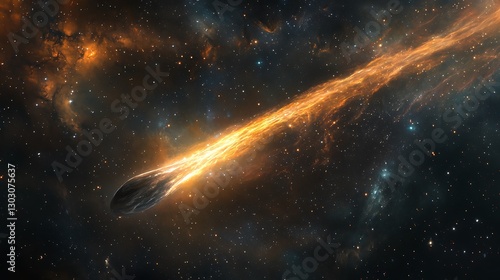 A comet with a long, radiant tail streaking across the backdrop of a dense starfield