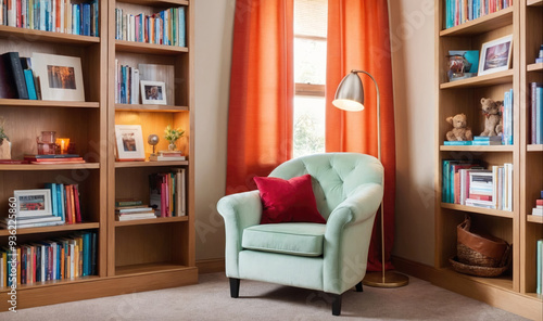 book, bookshelf, chair, cushion, red, green, lamp, window, living room, sunlight, home, interior, cosy, comfortable, decoration, decor, reading, relax, furniture, photograph, picture, design, home decor, interior design, bookish, home interior, lighting, natural light, floor lamp, house, relaxation