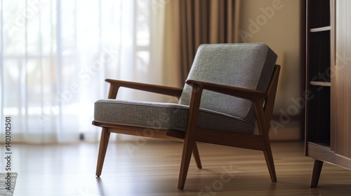 chair, wood, furniture, design, room, living, modern, comfortable, interior, style, home, empty, light, window, shade, cushion, fabric, armrest, frame, leg, natural, grain, pattern, floor, hardwood, apartment, cosy, lifestyle, minimalist, simple, neutral, elegant, clean, bright, daytime, sunlight, detail, warm, background, contemporary, relaxation, resting, cabinet, shelving, storage, decorative, soft, texture