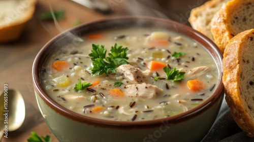 A comforting bowl of chicken and wild rice soup garnished with chopped parsley and cracked black pepper, Chicken and wild rice soup served in a ceramic bowl with steam rising delicately