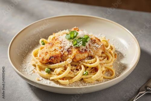 A comforting plate of creamy linguine topped with a golden-brown breaded chicken cutlet, generously sprinkled with parmesan cheese and fresh herbs for a perfect Italian meal.