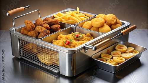 A commercial fryer filled with a variety of crispy fried foods , fried, fryer, food, commercial, french fries