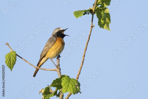 A common redstart (Phoenicurus phoenicurus), male, on a branch with open beak, singing, against a blue sky, Hesse, Germany