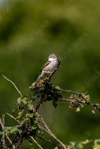 A Common Whitethroat perched on brambles in rural Sussex, on a sunny spring day