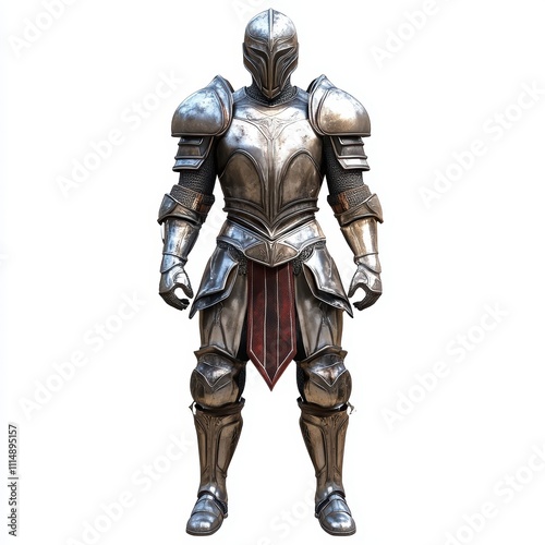 A complete suit of gleaming armor with a helmet, isolated on white background, perfect for fantasy storytelling, cosplay advertising, knight-themed branding campaigns