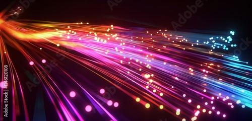A complex network of fiber optic cables with vibrant light pulses traveling through them, symbolizing high-speed data traffic against a sleek black background.