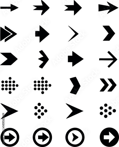 A comprehensive set of black arrow icons in various styles vector art illustration.
