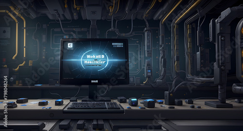 A computer motherboard with safety lock or pad lock as wide conceptual design, gold conductors, abstract design, monitor