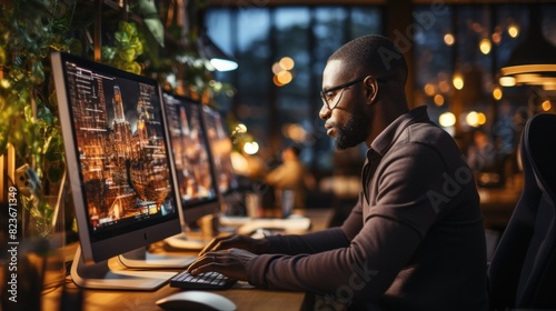 A concentrated professional works late at night on multiple computer monitors, reflecting dedication and a hard-working nature