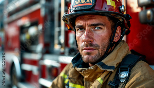 A confident American firefighter in full gear stands beside a red fire truck, embodying heroism.