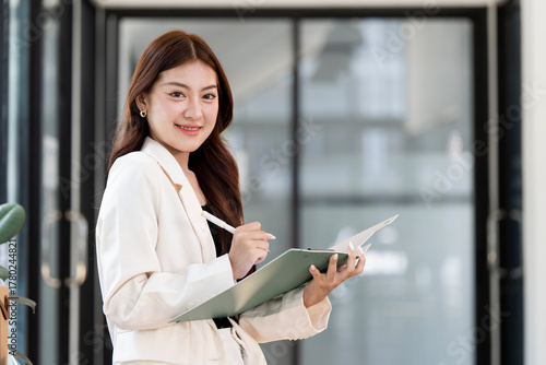 asian, woman, businesswoman, professional, corporate, confident, smiling, happy, successful, executive, leader, manager, job, career, office, workplace, lobby, modern, architecture, interior, glass wall, reviewing, document, file, folder, planning, strategy, pen, writing, formal, attire, elegant, adult, female, startup, entrepreneur, finance, consulting, marketing, ambition, determined, vision, communication, serious, positive, attitude, standing