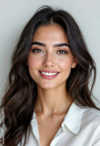 woman, portrait, dark, hair, smile, beauty, confidence, elegance, radiant, skin, fashion, style, professional, corporate, white, blouse, clean, minimal, fresh, glow, soft, lighting, even, charme, natural, attractive, feminine, model, head shot, closeup, face, honed, eyebrow, symmetry, classic, graceful, bright, aesthetic, branding, skincare, advertisement, brunette, smiling, person, people, make-up, brown, studio