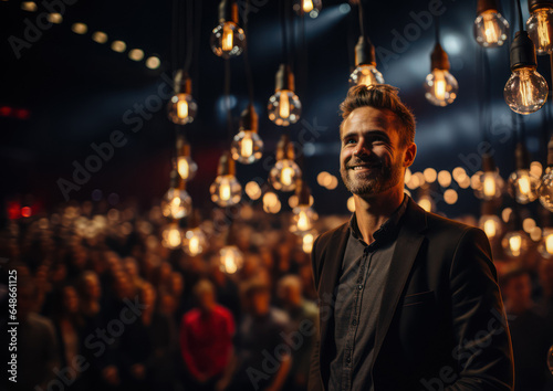 A confident entrepreneur pitching their idea on a stage in front of investors. Generative AI.
