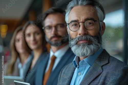 A confident group of business professionals stands together, radiating leadership and collaboration in a sleek modern office setting, emphasizing teamwork and strategic planning.