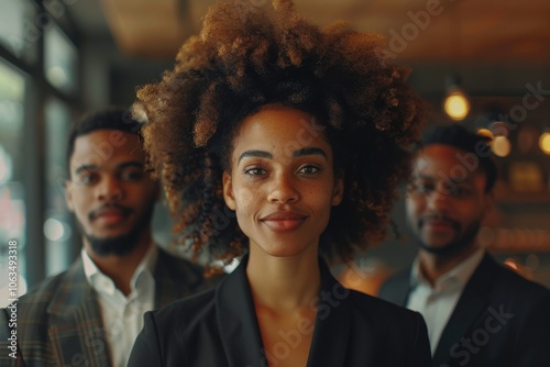 A confident group of diverse business professionals poses in a modern office setting. The focus is on a woman with a bright smile, exuding leadership.