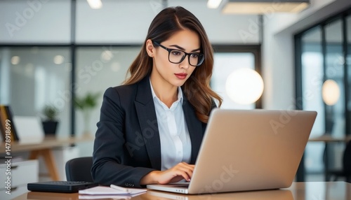 A confident professional woman in business attire works on her laptop in a sleek office, embodying dedication, focus, and productivity in a sophisticated, inspiring workspace.