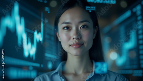 a confident woman analyzing financial data on futuristic screens, surrounded by holographic interfaces and digital graphs