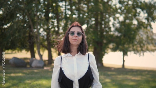 business, woman, people, outdoors, nature, confidence, sunglasses, stylish, sunny, standing, leisure, dress, fashion, tree, serene, casual attire, scenery, professional, posture, calmness, afternoon, personal, style, positive, individuality, sophistication, joy, freedom, cheerful, elegance, poise, charme, chic