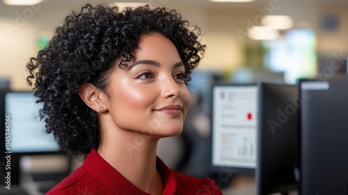A confident woman with curly hair smiles, seated in an office setting, focused on her work with computer screens in the background.