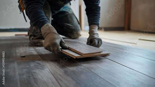 A construction site worker installing wooden floorboards. Featuring attention to detail and craftsmanship