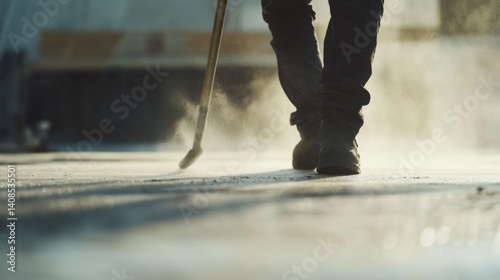 A construction worker cleaning the surface of a concrete slab. Featuring attention to detail