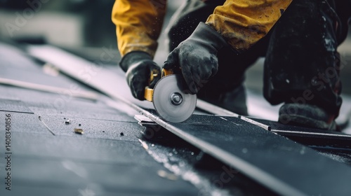 A construction worker cutting roofing tiles for installation. Featuring roofing and precision work