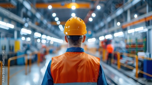 A construction worker in a hard hat and safety vest observes an industrial setting, embodying workplace safety and productivity.