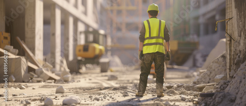 A construction worker in a high-visibility vest observes an active construction site surrounded by building frameworks and heavy machinery.