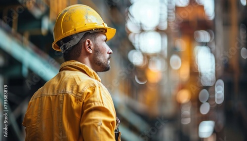 A construction worker in yellow overalls and hard hat stands in a factory