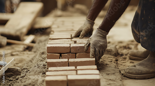 A construction worker laying bricks at a construction site. Featuring craftsmanship and patience