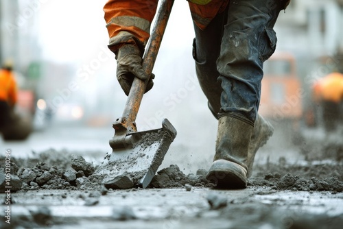 A construction worker using a jackhammer, breaking up concrete, illustrating the raw power and force required in heavy-duty construction