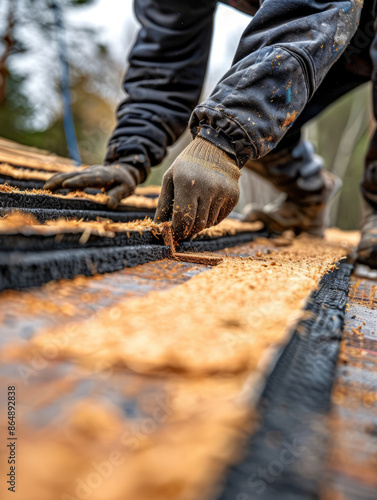 construction, men at work, hand, closeup, glove, repair, outdoors, autumn, building, manual labor, craftsmanship, effort, detail, roofing, renovation, industry, safety, precision, tool, material, texture, wood, project, carpenter's shop, action