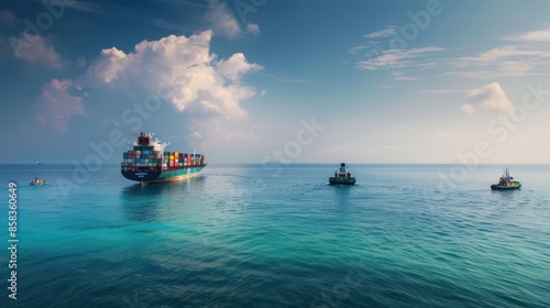 A container ship anchored offshore, with smaller boats transporting containers to and from the ship, against a tranquil seascape or coastal backdrop