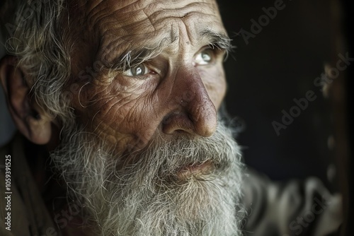 elderly, man, long, beard, thoughtful, gaze, dim, light, poverty, introspection, life, life events, ageing, isolation, window, melancholic, deep, thought, wrinkle, modest, home, late, afternoon, personal, story, emotion, face, old, age, bearded, contemplative, mood, solitude, shadow, depth, human, condition, wisdom, vulnerability, weathered, hand, soft, quiet, moment, expressive, eye, urban