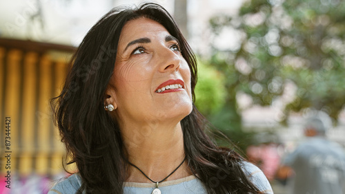 hispanic, woman, senior, mature, contemplative, garden, serene, outdoors, joy, lush, latina, elderly, smiling, portrait, female, age, beauty, nature, outside, leisure, casual attire, happy, greenery, peaceful, daylight, brightness, lifestyle, relaxation, well-being, sunlight, enjoyment, park, positive, pensive, dignity, bokeh, warmth, ageing, optimism, urban, city, cheerful, vibrant, expressive, authentic, individuality, mid-life, heritage