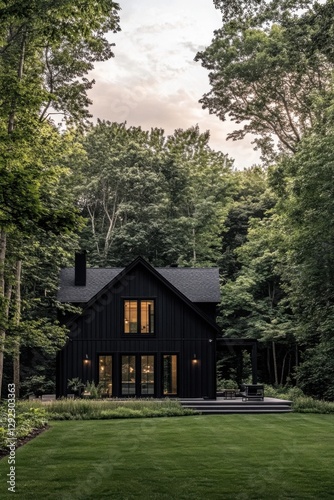 black, house, forest, twilight, modern, architecture, nature, serene, living, tree, cosy, peaceful, space, home, dusk, calmness, landscaping, evening, light, residential, design, country, sustainable, wood, dark, exterior, large, window, retreat, relaxation, stylish, garden, lawn, contemporary, natural, surrounding, harmony, warm, glow, furniture, secluded, private, craftsmanship, innovative, inviting, ambience, minimalist, open