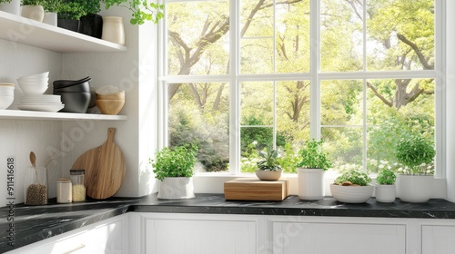 A contemporary kitchen showcases elegant cabinets, a dark marble backsplash, and large windows offering a view of greenery and skyline