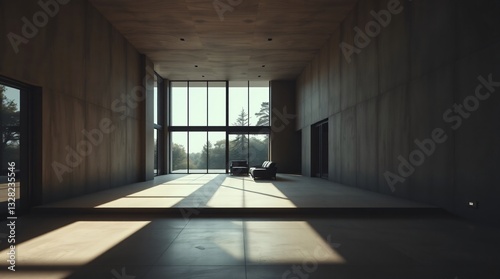 a contemporary minimalist house. raw concrete walls, large windows, and an open floor plan are highlighted with deep shadows creating a dramatic
