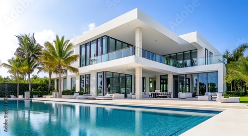 A contemporary modern white villa with large windows, surrounded by palm trees and an infinity clear swimming pool in front. The style is high luxury with detailed architecture and modern furnishings.