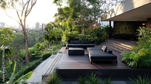 A contemporary rooftop space with minimalist black furniture, surrounded by lush greenery and wooden decking, offering a calm and tranquil outdoor retreat