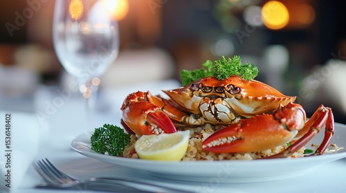 A cooked crab garnished with parsley and lemon sits elegantly on a white plate, set on a table with a wine glass and a fork in a softly lit dining setting.