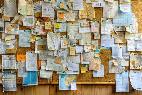A corkboard covered in papers, notes, and maps hangs on a wooden wall.