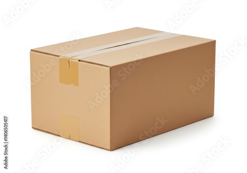 A corrugated cardboard box sealed with tape sits on a white surface in a studio setting