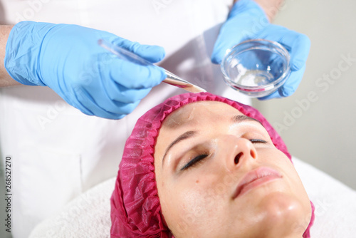 A cosmetologist puts a remedy on the face for the patient to nourish, moisturize and rejuvenate the skin. Cosmetology procedure in cosmetology clinic.