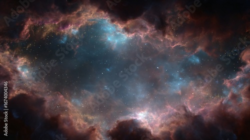 A cosmic nebula with swirling hues of deep space, showcasing a vibrant mix of blues, pinks, and oranges, highlights the beauty of celestial bodies, and depicts the vastness of the universe.