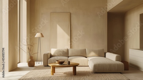A cosy, minimalist living room with a neutral color palette. The room includes a simple sofa, a coffee table, and a floor lamp, all arranged to create a comfortable and relaxing environment with