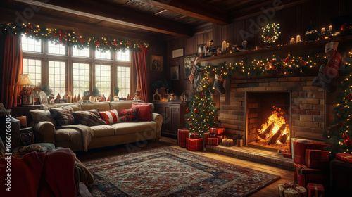 a countryside cottage living room decorated for Christmas, low wooden beams, roaring fire