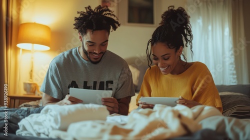 A couple folding clothes on the bed, each contributing to the task while sharing smiles and conversation.