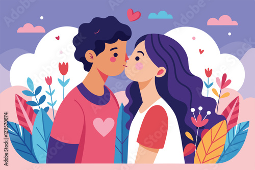 couple, kiss, love, affection, illustration, flower, heart, romantic, colourful, nature, relationship, young, happy, joy, art, design, scenic, lovebirds, hobby, emotion, playful, modern, vibrant, creativity, graphic, character, tenderness, togetherness, intimacy, celebration, happiness, youth, peaceful, casual attire, sweet, connection, summer, flirt, style, inspiration, harmony, beautiful, cheerful, cute, warmth, expressive, sweetness